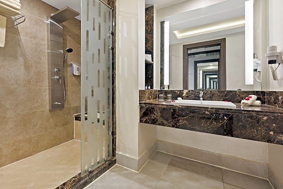 Vom Moment Ihrer Ankunft werden Sie mit herzlicher Gastfreundschaft empfangen und können sich auf eine entspannte Auszeit freuen. Tauchen Sie ein in die weitläufigen Außen- und Innenpools, entspannen Sie im Spa oder im türkischen Dampfbad (Hamam), oder gönnen Sie sich eine Massage (gegen Aufpreis). Genießen Sie köstliche Speisen im hoteleigenen Restaurant, Live-Musikauftritte oder entspannen Sie auf der Sonnenterrasse mit kostenlosen Strandsonnenschirmen und -liegen — und das alles bei kostenlosem WLAN und privatem Parkplatz. Für aktive Gäste gibt es einen Tennisplatz (kostenlos), einen nahegelegenen Golfplatz (gegen Gebühr) und ein Fitnesscenter (gegen Gebühr), sodass keine Langeweile aufkommt.